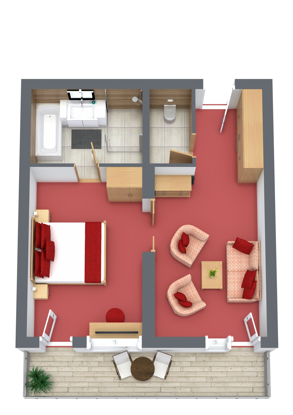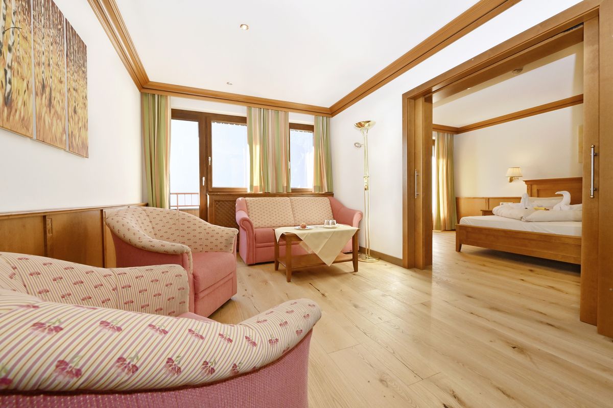 Suite mit Badewanne und Dusche/WC, Fernseher, Radio, Internetanschluss, Sitzecke, Bad und WC getrennt, Wohn- vom Schlafbereich getrennt, Parkettboden, Südbalkon, Ausziehsofa (1,40 breit)